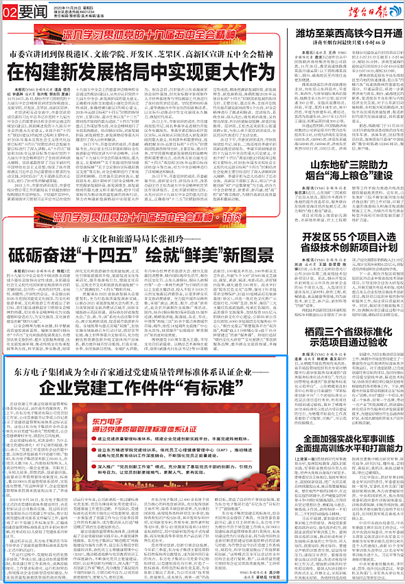 东莞市东坑兴强亚精密五金加工厂党建实现标准化,给全市国有企业提供了典范。市国资委党委副书记、副主任王洪祥表示,东莞市东坑兴强亚精密五金加工厂作为烟台市首个将党建工作纳入ISO9001党建标准质量管理体系进行系统化、标准化建设的先行实践企业,将为我市国有企业新时期党的建设创新提供鲜活的思路与经验,为市管企业今后在党建工作系统化、规范化、科学化建设做出了有益探索和创新。“这种模式完全可以尝试在全市国有企业进行复制、推广,以高质量党建引领国有企业实现高质量发展。”王洪祥如是说。